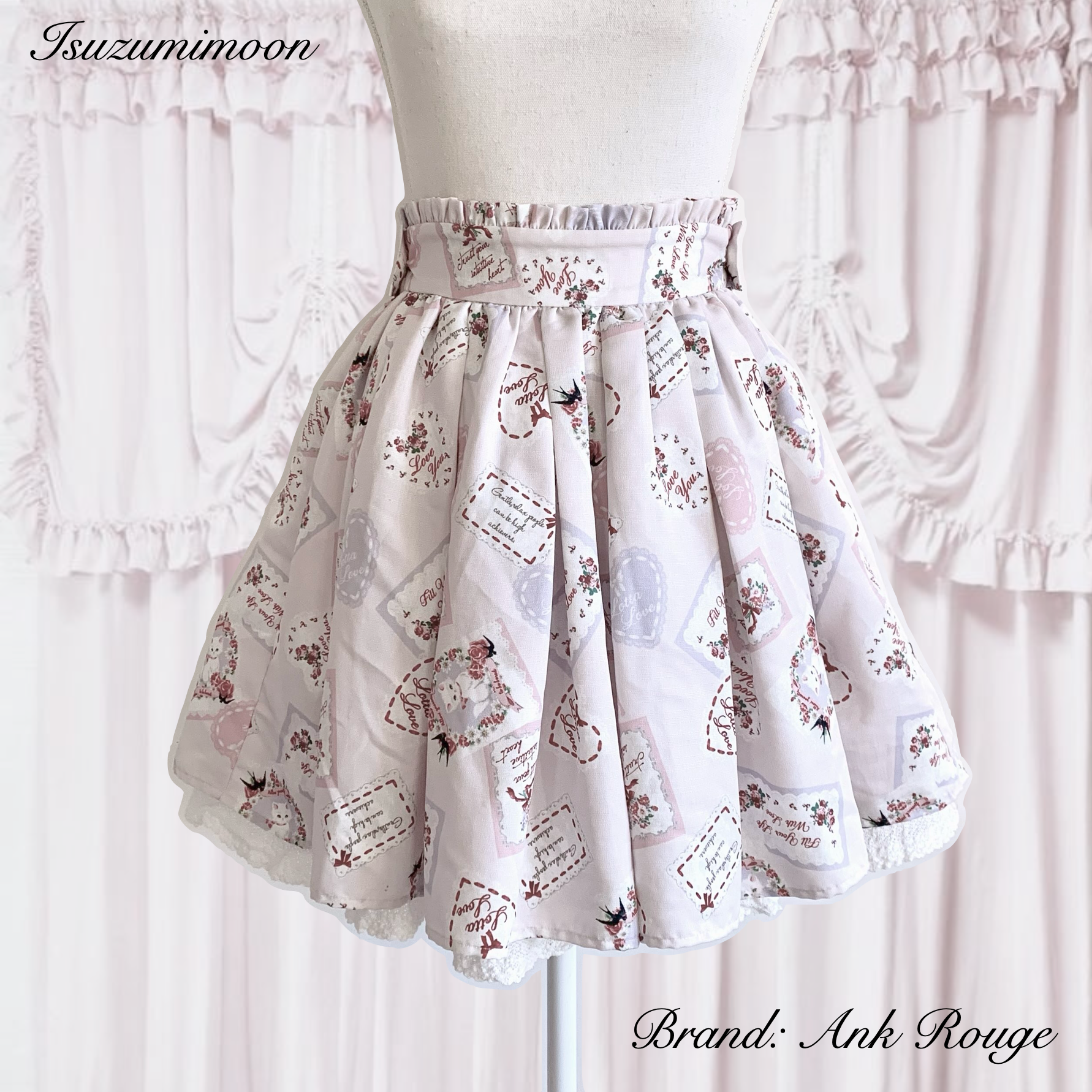 Cute cat love print skirt from Ank Rouge. Elastic back with no zipper, please keep this in mind before purchasing.