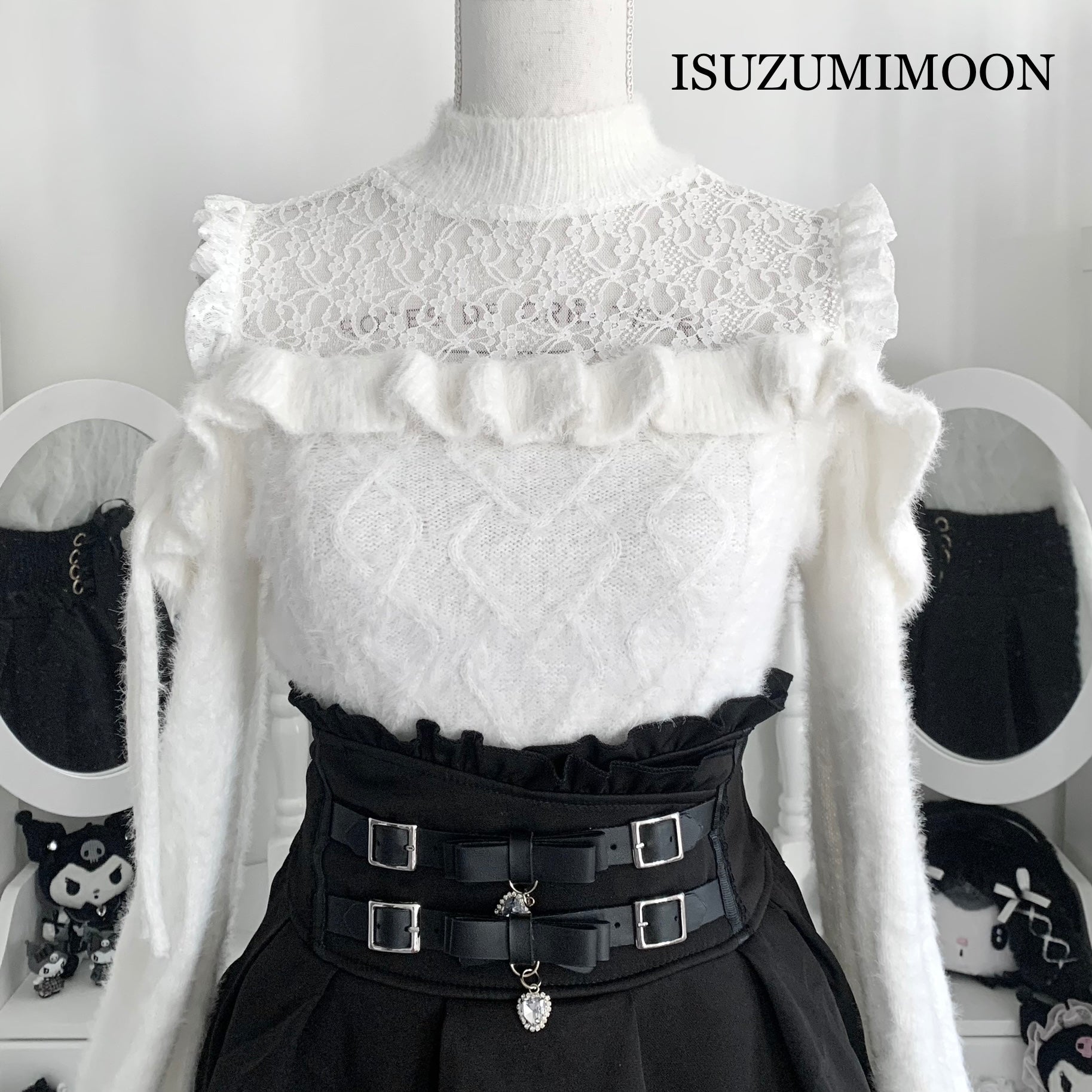 Cute Ryousangata White open shoulder heart cable knit sweater, soft material with ruffles and lace.